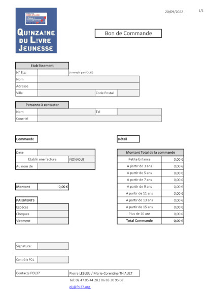 Le bon de commande ci-dessous est à l’intention des structures. Vous pouvez y regrouper l’ensemble des commandes des familles avant de nous le retourner par mail. Vous pouvez aussi l’utiliser pour vos propre commandes d’établissement.